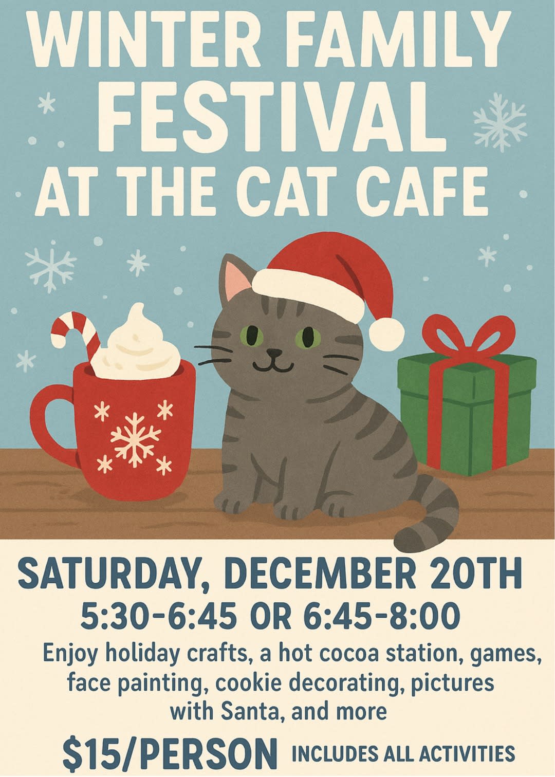 Join us for our Winter Family Festival at the Cat Café! Enjoy a festive evening filled with holiday crafts, cookie decorating, games, face painting, pictures with Santa, and more. Hot cocoa, pizza slices, and snacks are available for purchase.